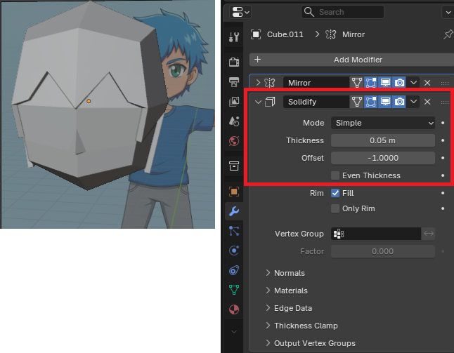 「AddModifier」に「Solidify」を追加して厚みをつけます。