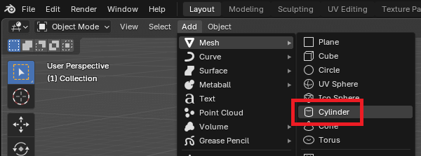 Blenderを起動したら、初期表示されている立方体を削除します。削除したら「Add」→「Mesh」→「Cylinder(円柱)」を追加します。(キーボードのShift+Aからも追加できます)