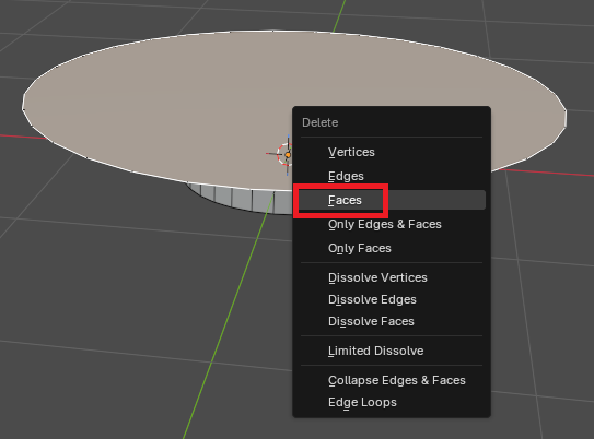 皿の作成と同じように「Add」→「Mesh」→「Cylinder(円柱)」を追加。「編集モード」に変更して、面選択モードにして上面を削除します。