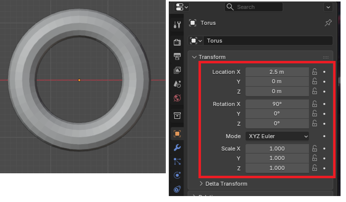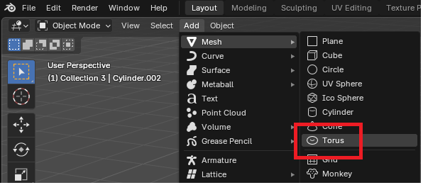 「Add」→「Mesh」→「Torus(トーラス)」を追加します。ドーナツ型のオブジェクトです。