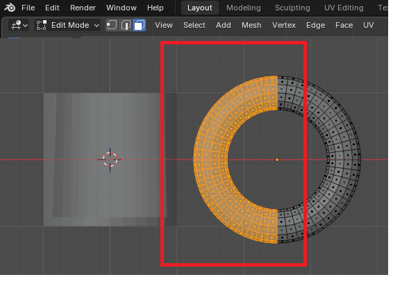 編集モード(EditMode)に変更して、面選択モードにします。透過表示にして左半分を選択。キーボードのXから面を削除して、半ドーナツのような形にします。