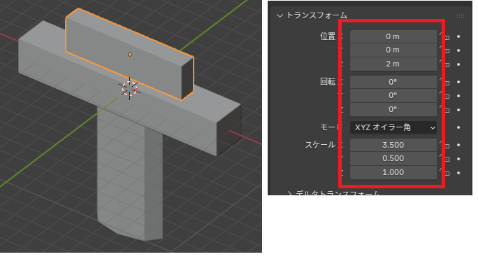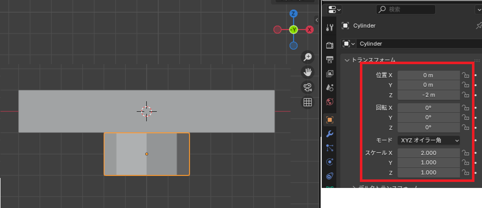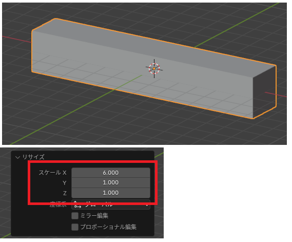 Blender起動時に初期表示されている立方体、X方向のスケールを変更します(キーボードのS→X)。