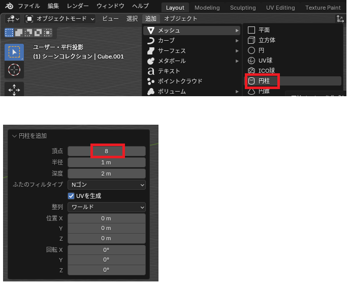 「追加」→「メッシュ」→「円柱」を追加します。頂点数は8程度に減らします。