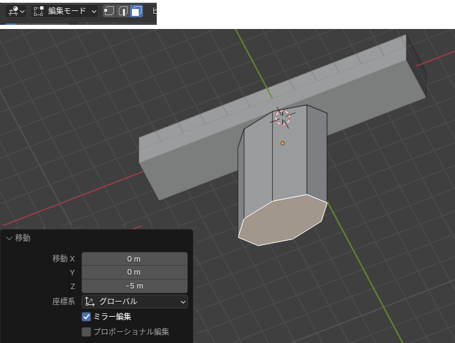 編集モードを「面選択」に変更、下の面を選択して下に伸ばします(キーボードのG)。