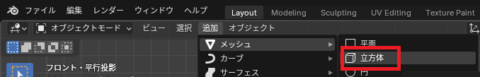 次に剣の部分を作成します。「追加」→「メッシュ」→「立方体」を追加します。