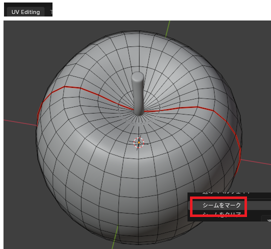「UV Editing」画面に移動。「編集モード」の「線選択」にして、任意の場所を一周選択して右クリックからシームをマークします。