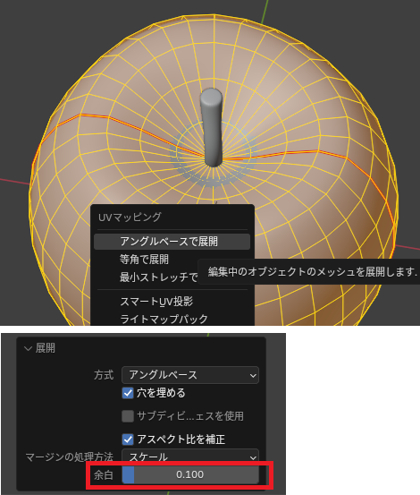 シームをマークしたらすべてを選択して(キーボードのA)、キーボードのUから「アングルベースで展開」します。この時、下の方に展開設定が表示されるので余白に少し余裕を持たせます。