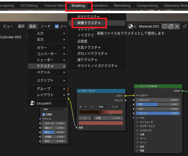 「Shading」を選択して、マテリアル内に「追加」→「テクスチャ」→「画像テクスチャ」を追加します。