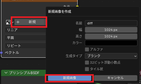 「画像テクスチャ」の新規を選択して、新規画像を作成します。幅や高さは2048×2048、4096×4096などでも問題ないです。