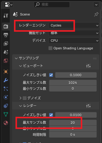 レンダープロパティにて「レンダーエンジン」を「Cycles」に、レンダーの最大サンプル数を小さくします(ここでは20にしています)。