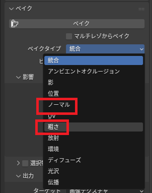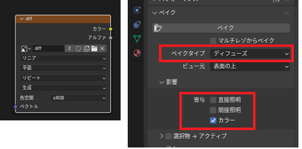 追加した2つの画像テクスチャが選択状態(白枠)になっていることを確認して、ベイクからベイクタイプを「ディフューズ」に、影響の寄与をカラーだけにチェックにします。設定したらベイクボタンを押します。
