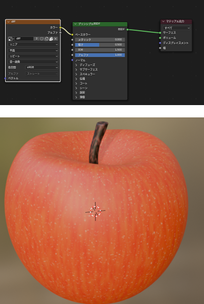 今回のリンゴの場合、実と茎の2つのマテリアルが作成してあるので、両方に画像テクスチャを追加して、同じ画像を指定します。