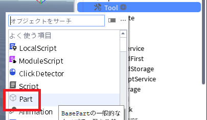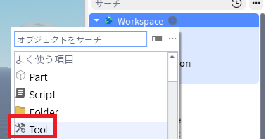 まずは触ると持ち物に入る道具を作ってみます。「Workspace」の「+」から「Tool」を選択します。