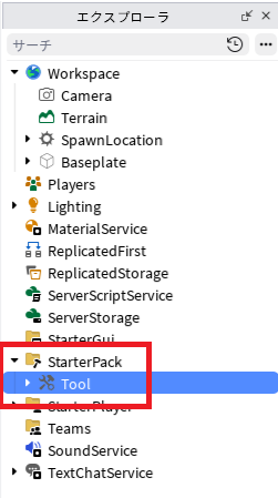 作成したToolを「StarterPack」に移動します。StarterPackに追加すると初期でバックパックに追加されます。