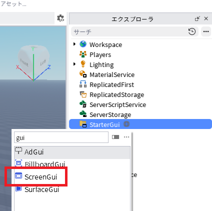 エクスプローラ内の「StarterGui」配下に作成したGUIが各プレイヤーに追加されます。まずは配下に「ScreenGui」を追加します。