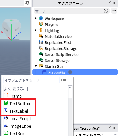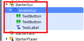 追加した「ScreenGui」配下に基本となる「TextLabelを1つ」と「TextButtonを2つ」追加します。