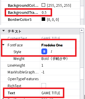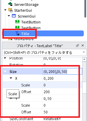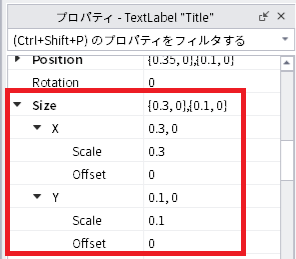 「TextLabel」は「Title」に名前を変更して、サイズを変更します。Offsetでラベルサイズを変更するとゲームの画面サイズ(PCやスマホ)によって意図した位置と違う場所に表示されます。
