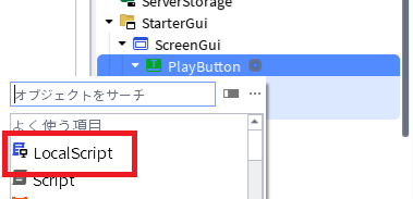 「PLAY」ボタンを押した時にラベルやボタンを消してみます。「PlayButton」の配下に「LocalScript」を追加します。