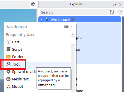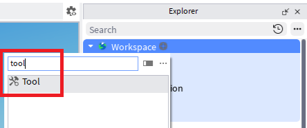 岩を壊した後に拾うことのできる石を出現させます。「Workspace」の「+」から「tool」を選択します。