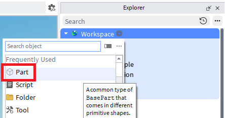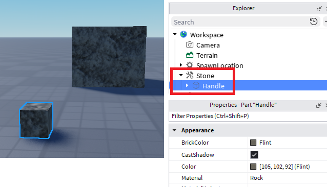 「tool」の名前を「Stone」に変更して、配下にPartを追加します。「Part」の名前を「Handle」に変更して色、マテリアルも変更します。