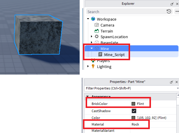 「Part」の名前を「Mine」に変更、色、マテリアルを変更して、配下にスクリプトを追加します。