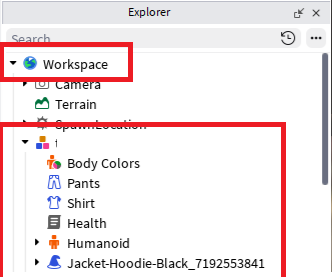 ゲーム実行時に「Workspace」配下にもプレイヤーが追加されます。こちらは「Character」となります。