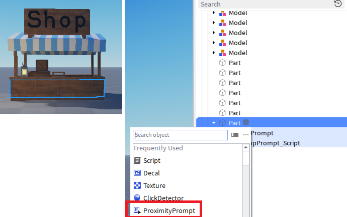 ショップのモデル内から正面のパーツを探し出して、「Part」配下に「ProximityPrompt」を追加して、配下に「Script」を追加します。