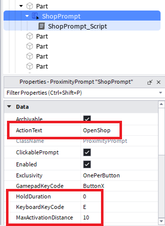 「ProximityPrompt」の名前を「ShopPrompt」に変更して、各プロパティを好きなように変更します。スクリプトは「ShopPrompt_Script」に名前を変更します。