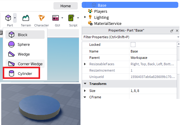 まずはタレットを作成します。「Part」の「Cylinder」を追加して土台にして名前を「Base」にします。
