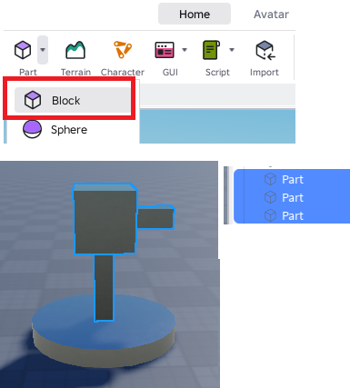 「Part」の「Block」を3つ追加してタレットのような形にします。