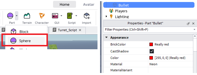 発射される弾を作成します。「Part」から「Sphere」を追加して名前を「Bullet」に変更、色とマテリアルも分かりやすのに変更します。