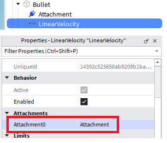 「Bullet」配下に「LinearVelocity」、「Attachment」を追加。「LinearVelocity」にアタッチメントをセットします。