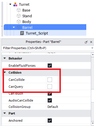 タレットの先端のパーツ(ここではBarrel)のCollison設定を変更します。弾が先端から出るときに衝突しないようにするためです。また、スクリプトを配下に追加します。