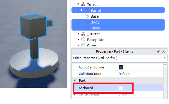次にタレットを回転させてみます。まずは一番下のパーツ以外のパーツの「Anchored」のチェックを外します。