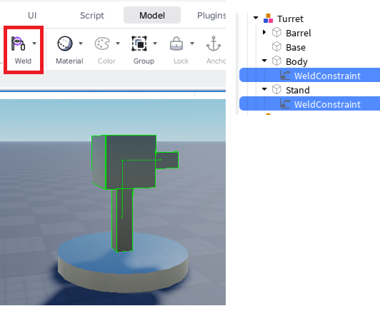 「Weld」を追加してそれぞれのパーツを接続します。