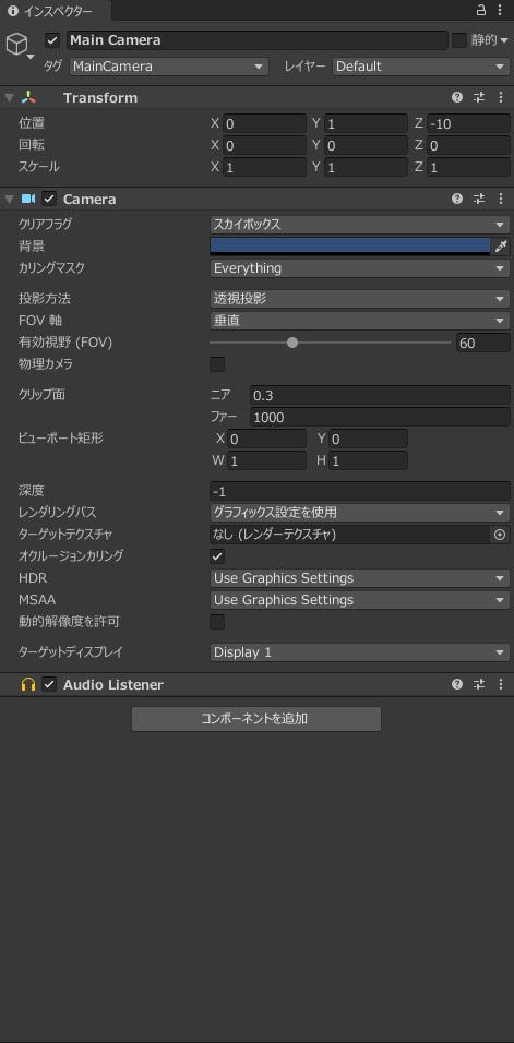 画面右側にあるのがInspector(インスペクター)です。下記はMainCameraを選択した状態です。選択した物の詳細情報を見て、設定できる場所ですね。