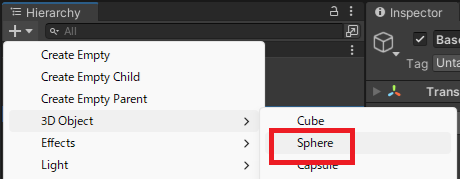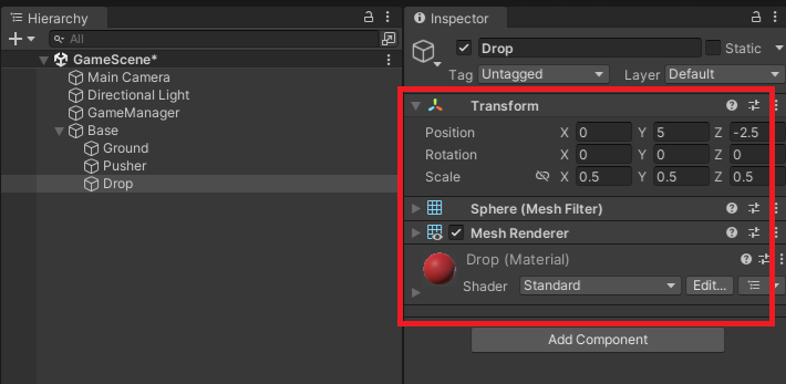 まずはコインの落とす位置を変更します。Hierarchyで「3DObject」→「Sphere」を選択、コインを落とすオブジェクトになります。名前をDropに変更して、位置と色を変更しておきます。