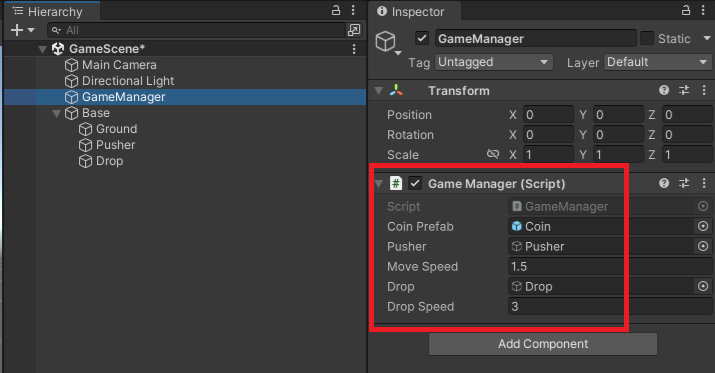 GameManagerスクリプトを下記に変更します。コインを落とすオブジェクトを移動するのを追加しています。