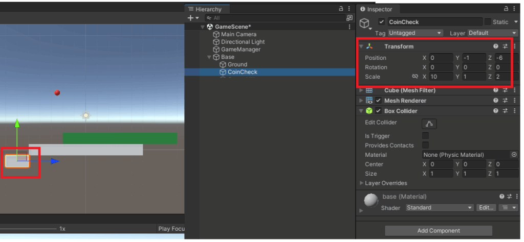 次に台から落ちたコインの数をカウントしていきます。Groundをコピーして名前を「CoinCheck」に変更、位置とスケールを変更します。