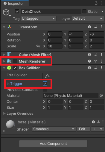 MeshRendererをオフにして見えなくします。また、BoxColliderのisTriggerにチェックを入れます。