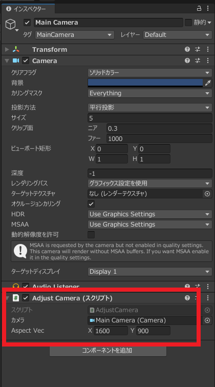 RenderModeをCameraにして、参照解像度を1600×900(16:9)にしておきます。これが今回のベースとなる解像度です。